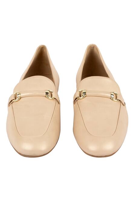 Beige loafers featuring a buckle strap and closed toe design with stitch line detailing