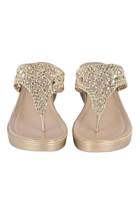 Gold leather wedge sandals featuring a braided strap design