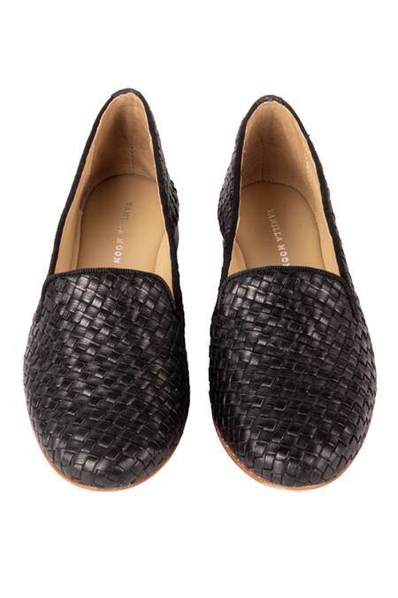 Black handcrafted mules featuring a basket woven pattern and closed toe design