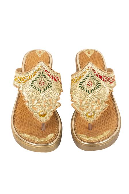 Gold wedge sandals featuring intricate embroidery and a toe post design