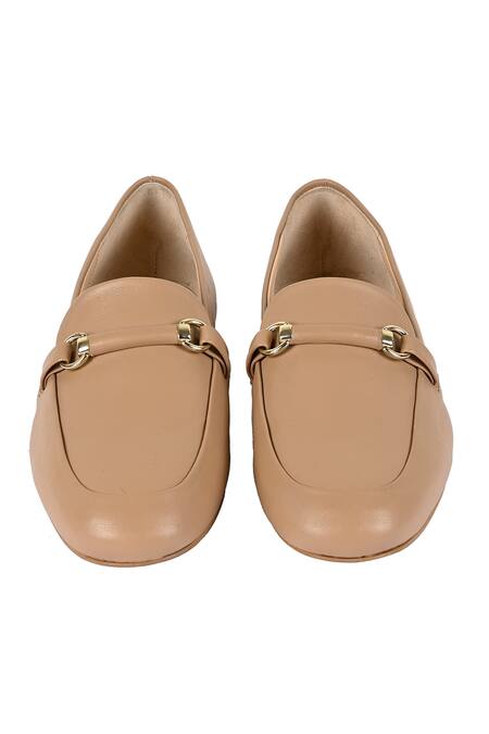 Beige leather loafers featuring a metallic saddle trim and round toe detailing