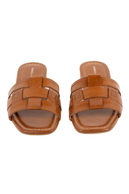 Brown leather flats featuring an open toe design with geometric cross-patterned broad weave and self-stitch detailing