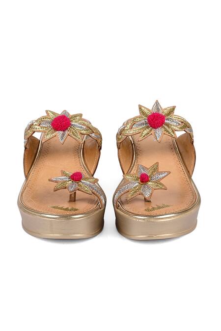 Delicate gold and silver floral design, Fresh fuchsia pom poms atop the sandals, Intricate braid detailing on the upper strap