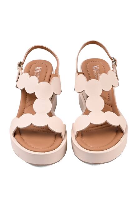 Ivory wedge sandals featuring a scalloped edge upper and cushioned stitched insole