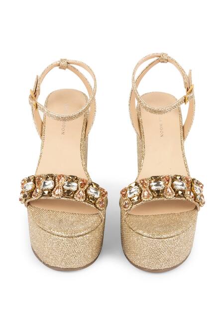 Gold open toe wedges with crystal work strap & adjustable buckle.