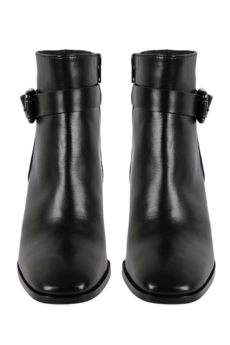 Black ankle boots featuring a pointed toe and a pewter buckle strap