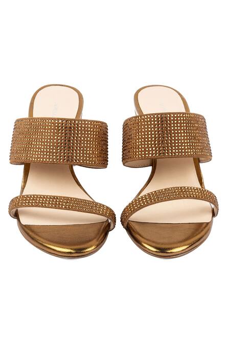 Tan block heel sandals featuring silver beaded straps and open toe design