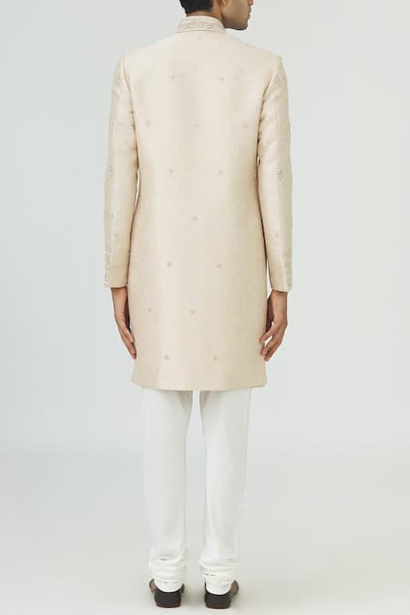 Peach brocade sherwani with placement bead work. Comes with off-white churidar.