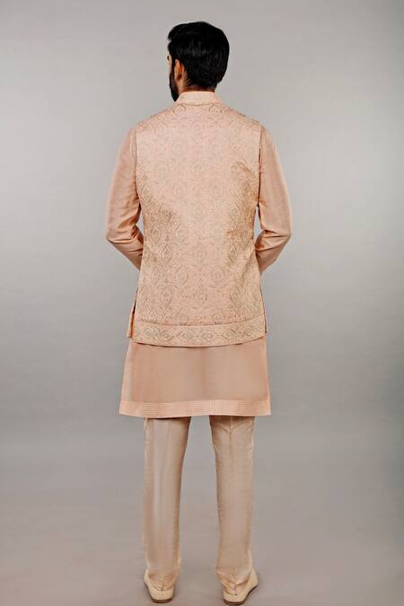 Beige kurta with band collar and full sleeves. Paired with embroidered beige bundi and churidar.
