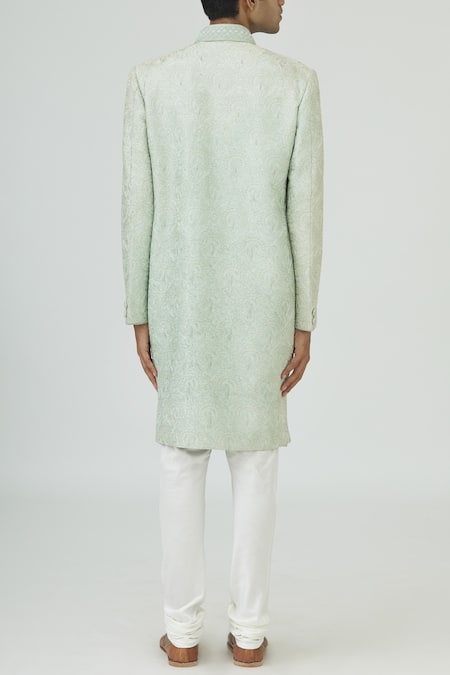 Mint sherwani with all over floral and leaf work. Comes with off-white churidar.