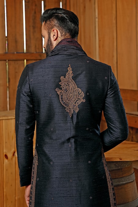 Navy blue sherwani with all-over placement aari worked motifs. Comes with contrast salwar & dupatta.