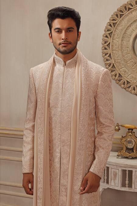 Blush sherwani with intricate embroidered details. Paired with a kurta and trousers. Comes with a dupatta with embroidered border.