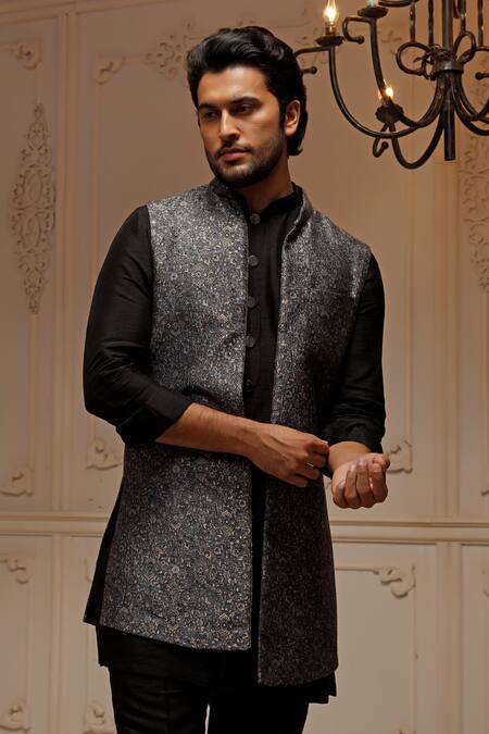 Grey sleeveless bundi in pashmina blend silk featuring an all-over floral pattern. Paired with a long-sleeve kurta and trouser.