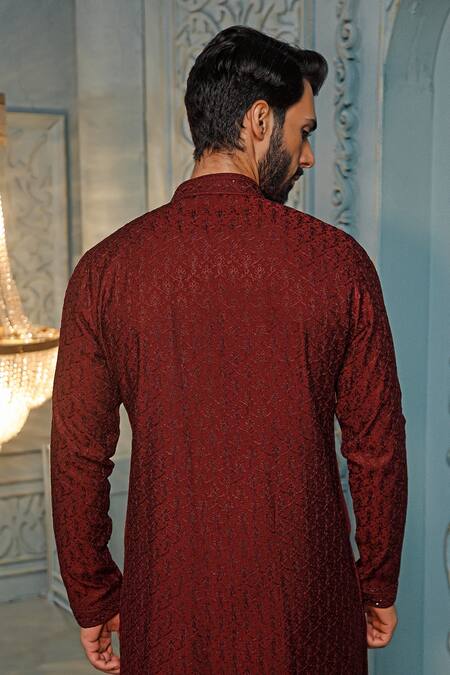 Wine kurta with lucknowi style all-over resham embroidery & front buttons. Paired with churidar.