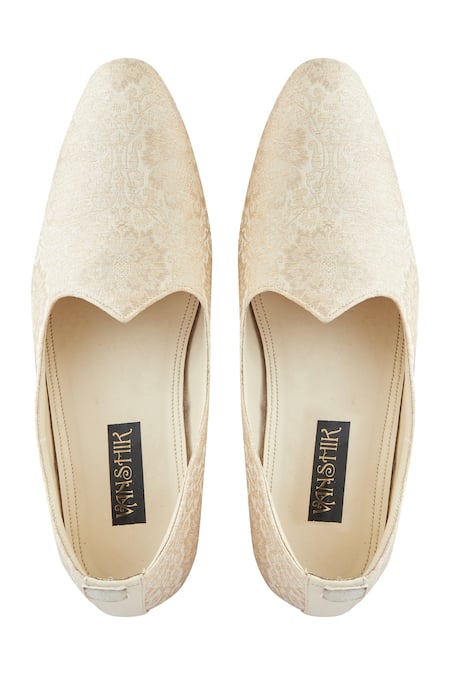 Beige juttis in silk fabric with self-floral embroidered motifs.