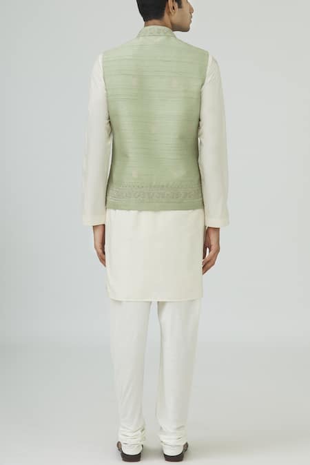 Green Nehru jacket with placement thread work. Comes with white straight kurta & plain churidar.
