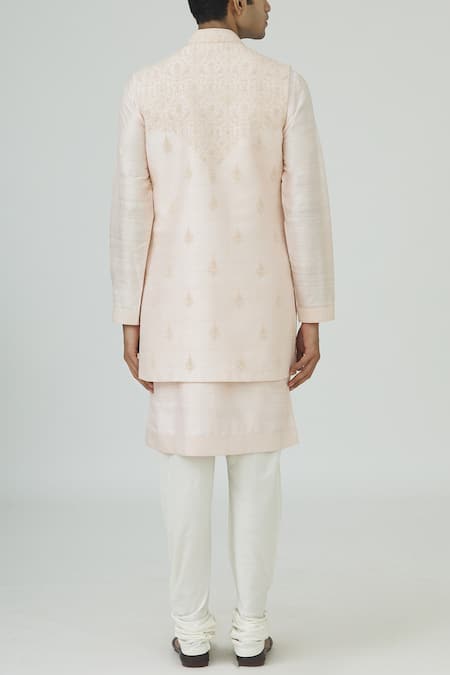 Pink long Nehru jacket with all-over floral motif work. Comes with plain kurta & white churidar.