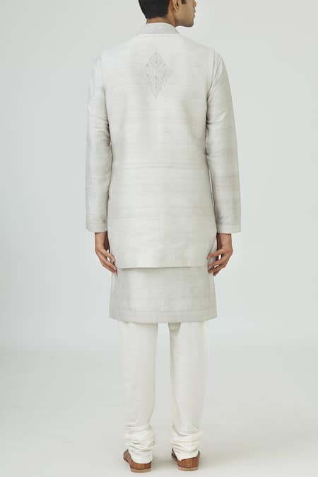 Silver long Nehru jacket with all-over bead work. Comes with plain kurta & white churidar.