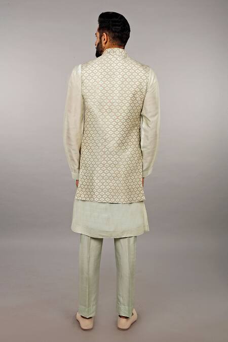 Mint kurta with band collar and full sleeves. Paired with self embroidered jaal bundi and straight pant.