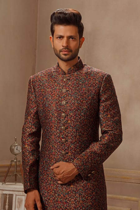 Multi color woven pushmina blend sherwani. Paired with black pant.