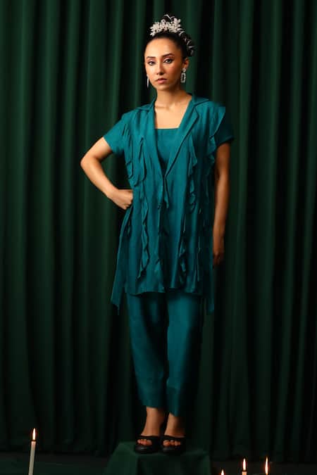 Green half sleeves lapel collar blazer featuring all-over ruffles detailing. Paired with a matching sleeveless padded top and straight pant.