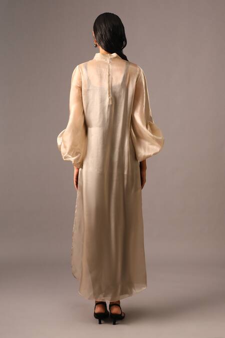 Fluid organza overlay with draped detailing, Balloon sleeves design, Attached lining for comfort