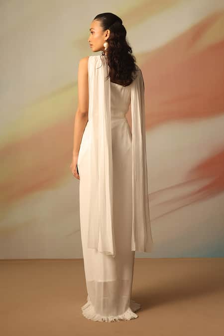 White kurta set featuring a double georgette blouse with a unique cut-out design. Paired with a long skirt and an organza dupatta, lined with taffeta.