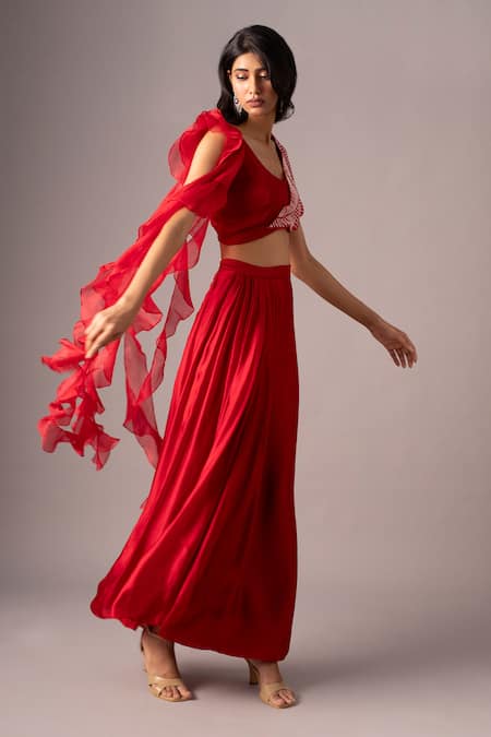 Red Satin Georgette Cutdana, Elara Embroidered Ruffle Top And Draped Skirt Set