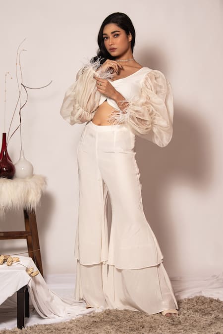 White top with front ruch details and exaggerated organza feather sleeves. Paired with white two layer pant.