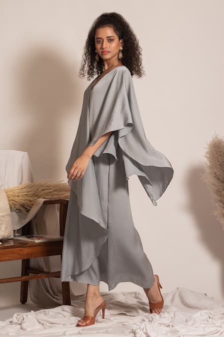 Grey one shoulder asymmetric drape dress featuring a V neck design