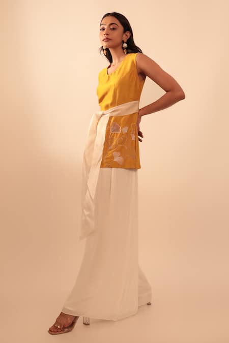 Mustard tie-up top with floral hand embroidery. Paired with white wide leg pant.