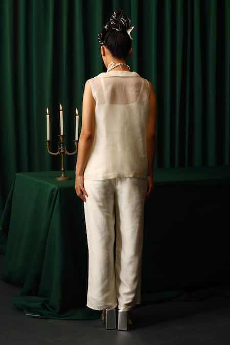 White sleeveless lapel collar blazer style jacket with all over starry sequin embellishments. Paired with matching sleeveless padded top & straight top.