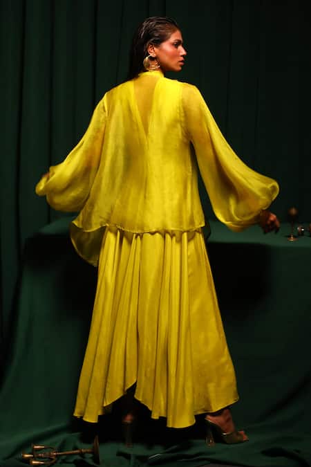 Yellow Organza, Brocade, Taffeta Pearls Neon Asymmetric Gown And Jacket Set