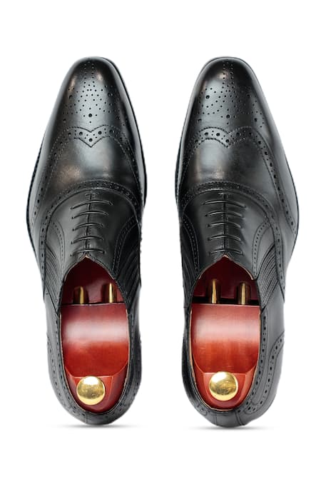 Black leather lace-up brogue shoes featuring perforated details and stitch lines