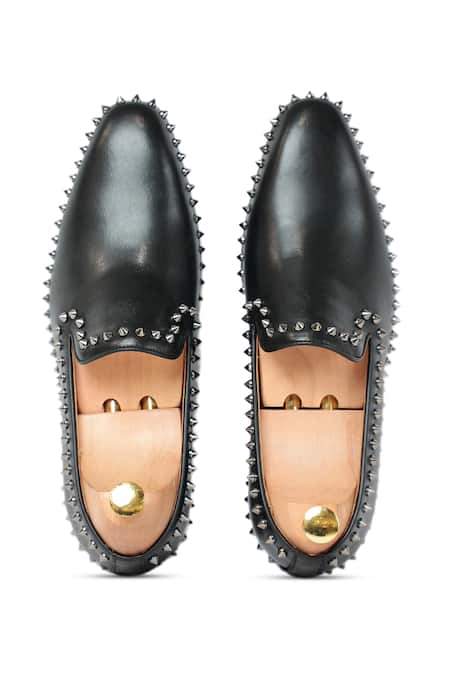 Black leather slip-on loafers featuring stud embellishments along the borders