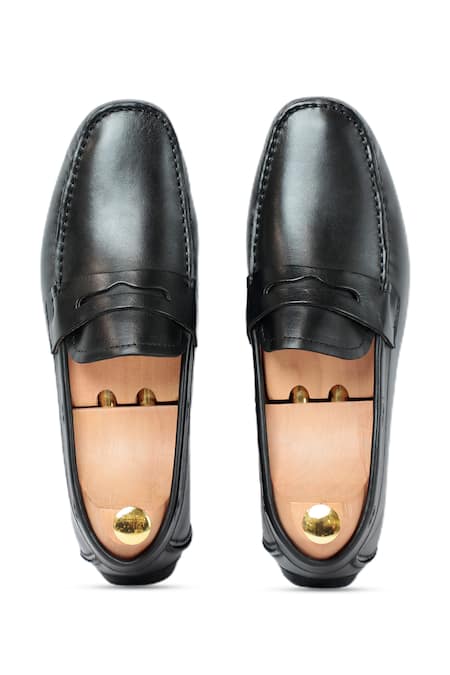 Black leather driving moccasins featuring a slit penny strap on top and stitch line details