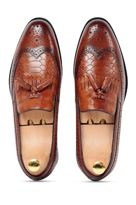 Brown leather shoes featuring a crocodile textured base and perforated brogue design