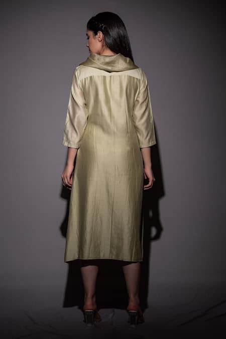Green organza and silk chanderi cowl neck kurta with embroidered detail.