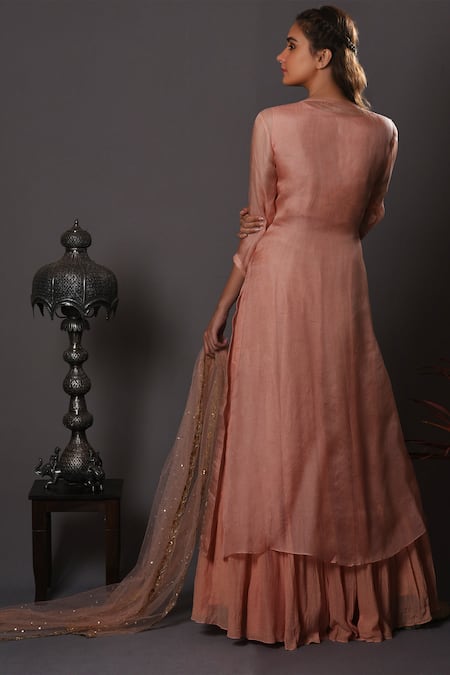 Pink tiered inner anarkali enhanced with crushed texture paired with embellished long jacket. Comes with sequin embellished dupatta.
