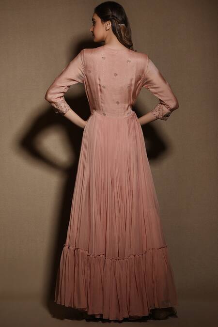 Peach flared anarkali with placement floral motif bead work, pleated flare & cuff sleeves.
