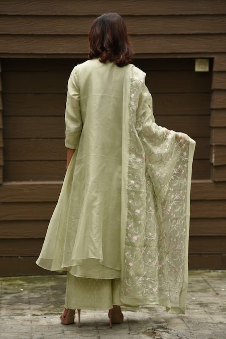 Green cape highlighted with floral hand embroidery, round neckline, sleeveless and asymmetric hem. Comes with kurta, palazzo and dupatta.