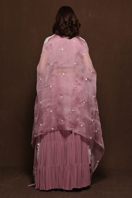 Buy_Vara By Vibha N Priti_Pink Organza, Chiffon Crop Top Round Cape Open Embroidered And Sharara Set _at_Aza_Fashions