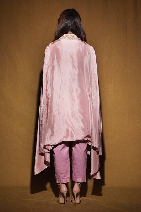 Pink jacket highlighted with intricate hand embroidery, open neckline and asymmetric hem. Comes with kurta, pant and belt.