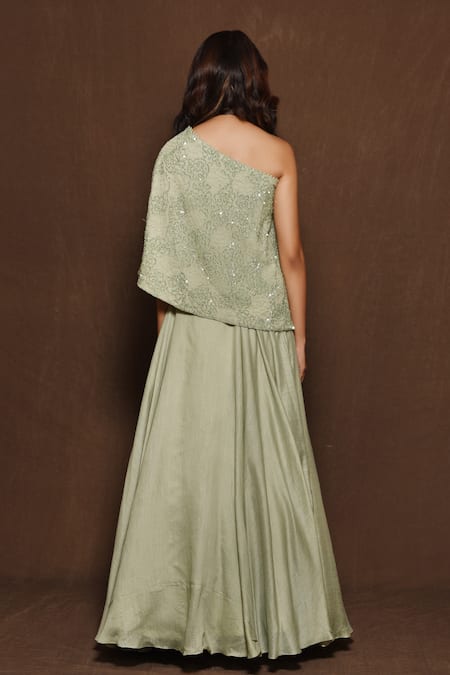 Green top highlighted with floral hand embroidery, one-shoulder neckline and asymmetric hem. Comes with lehenga.