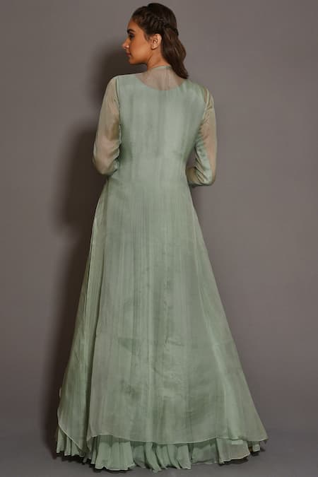 Green sheer long jacket with all-over floral motif work. Comes with pleated anarkali dress enhanced with flounce hemline.