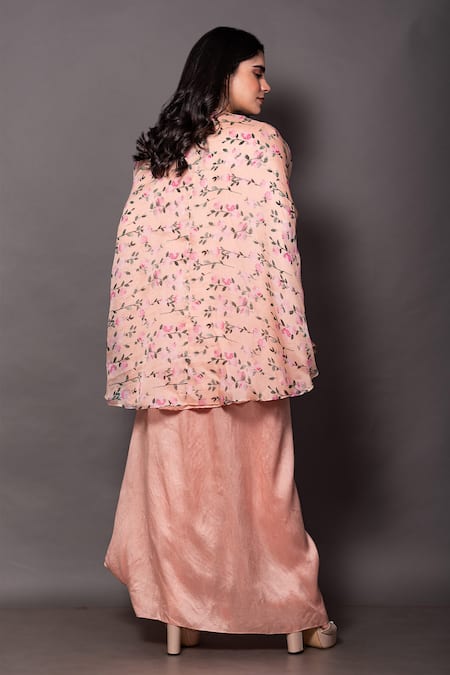 Peach floral print cape featuring zari, cutdana, and gota work. Paired with a round neck blouse and pleated draped skirt.