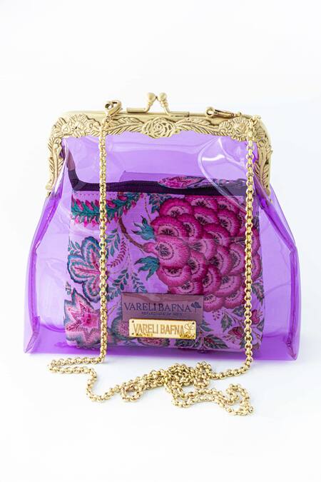 Violet potli style clutch featuring a floral carved frame and chain
