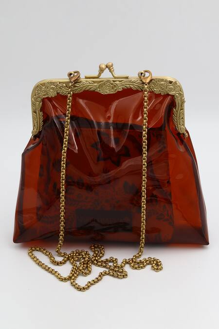 Brown potli-style clutch featuring a floral carved frame and a chain