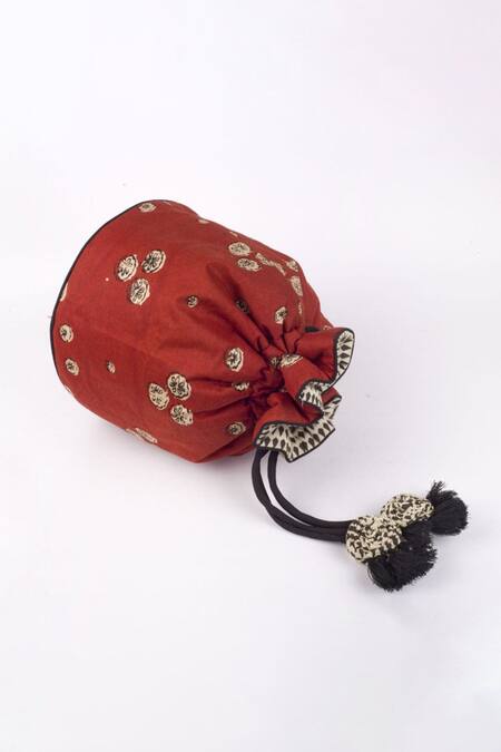 Red potli bag featuring chappa bloom print and handmade flower tassels detailing