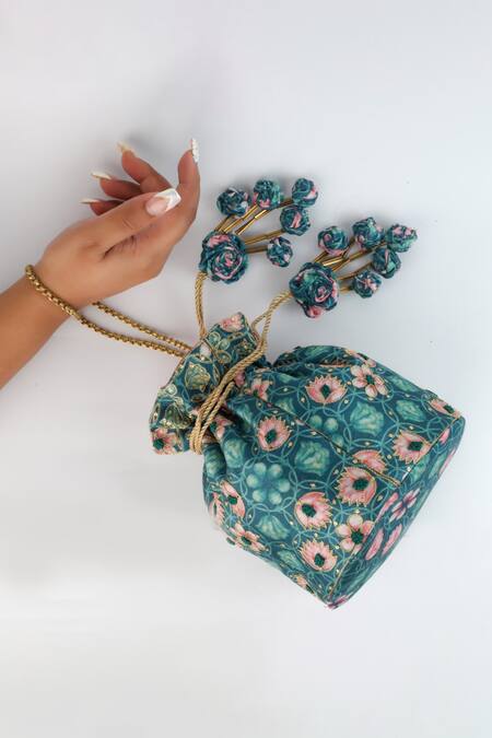 Green potli bag featuring kamal phool print with zari, sequin, and french knot embroidery